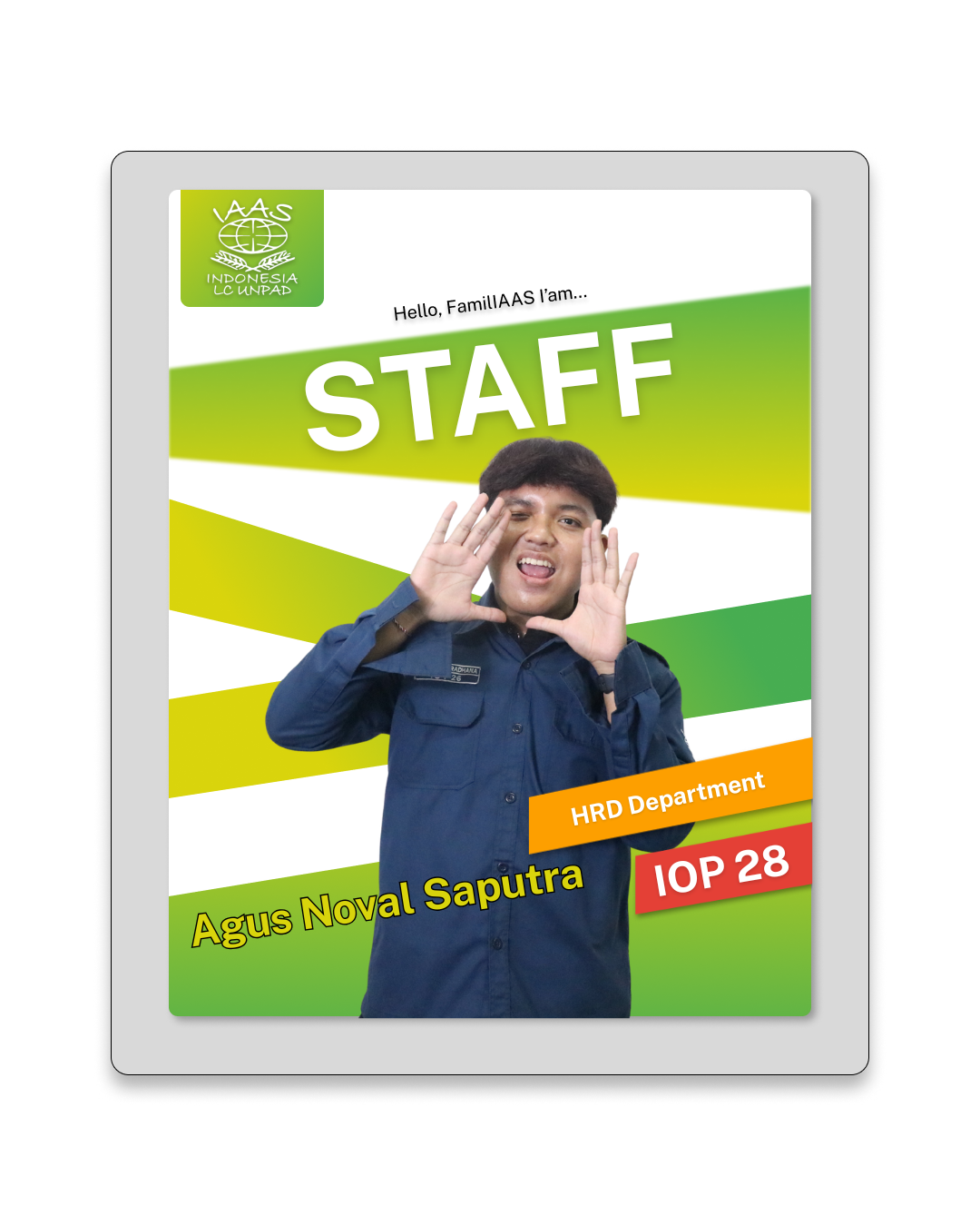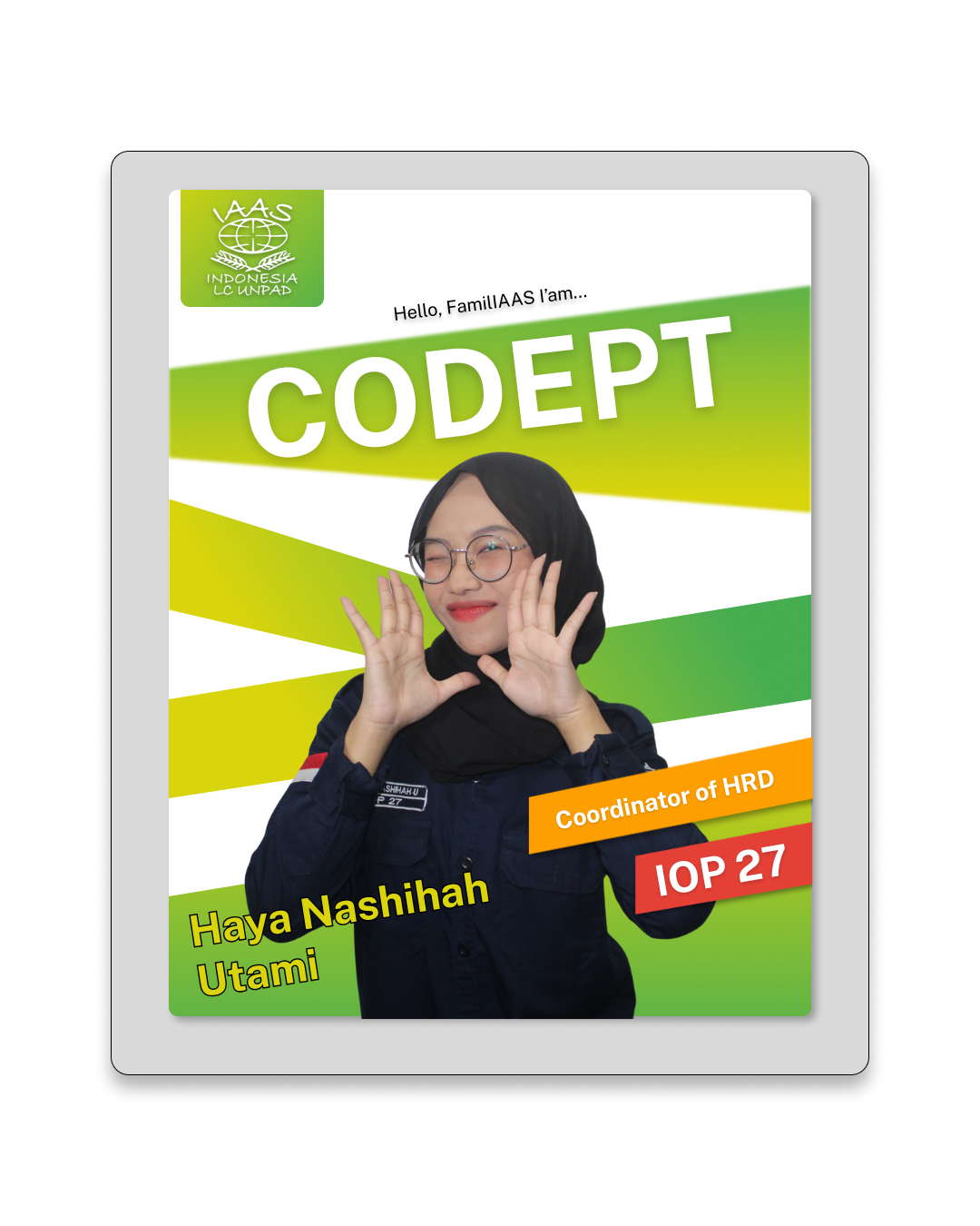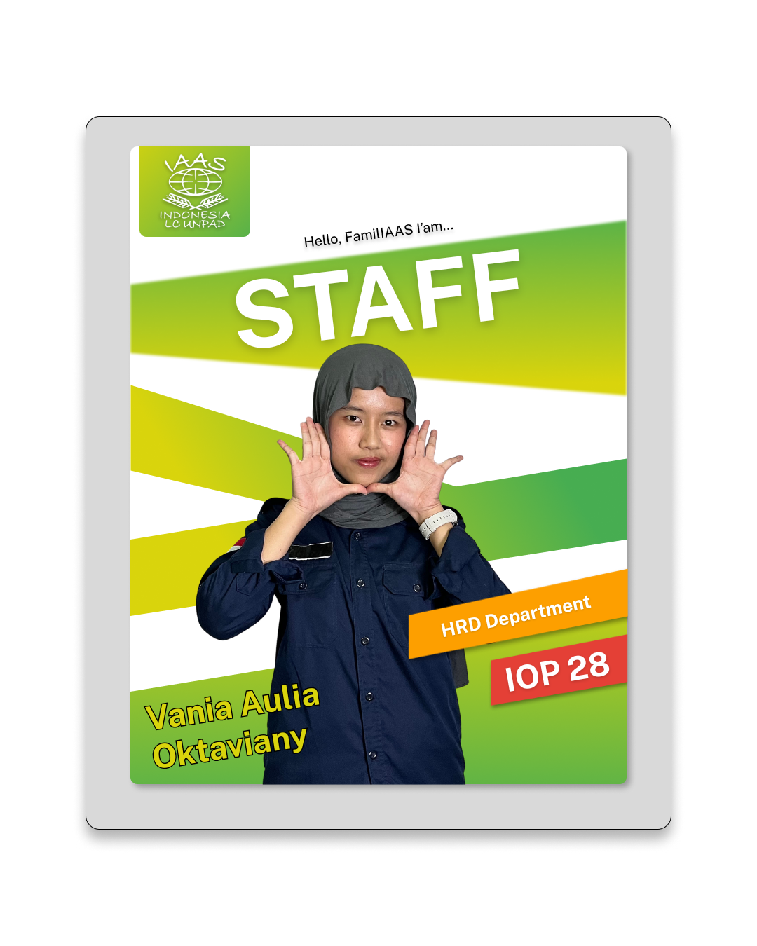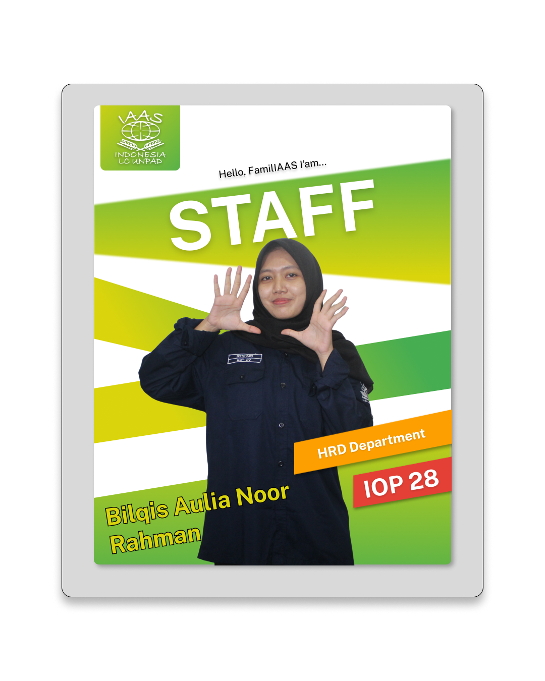 The Human Resources and Development Department is one of five departments within the IAAS LC Unpad organization. This department is responsible for developing skills, recognizing achievements, monitoring and evaluating performance, fostering a sense of belonging and camaraderie among all IAAS LC Unpad members, and conducting open recruitment for new IAAS LC Unpad members. The work programs implemented by the Human Resources and Development Department of IAAS LC Unpad consist of six activities: IAAS Birthday Card and Congratulations, IAAS Faway, IAAS Anniversary X Skill Development, IAAS Gathering, IAAS Looking for New Members, and Peer Assessment.